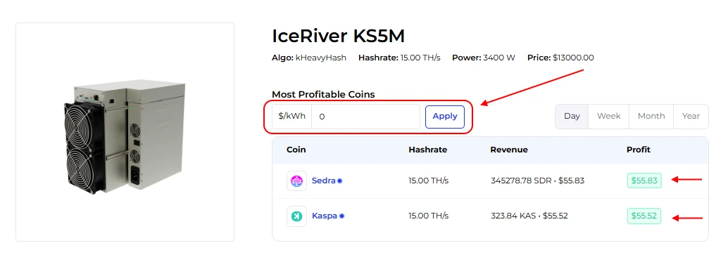 | KS5M | KAS، SDR | 15 TH/s (±10%) | 3,4 كيلوواط (±10%) | ~55$ / اليوم |