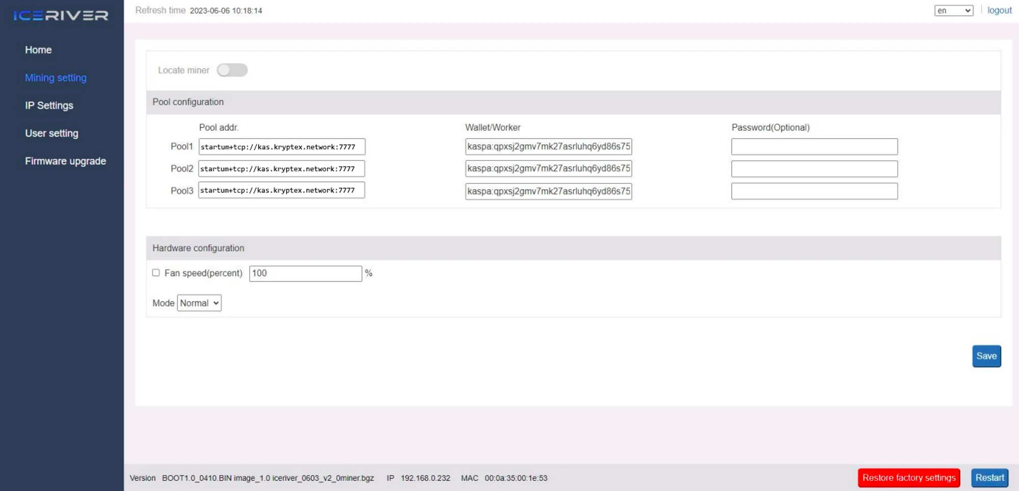 kaspa:qp8u4wzjhy5m8h63cz7kvczpdksd3cqghptf5nakghmue5ffqlvyusw30dgpg— عنوان محفظتك، يبدأ بـkaspa:iceriver— اسم جهاز ASIC الخاص بك.