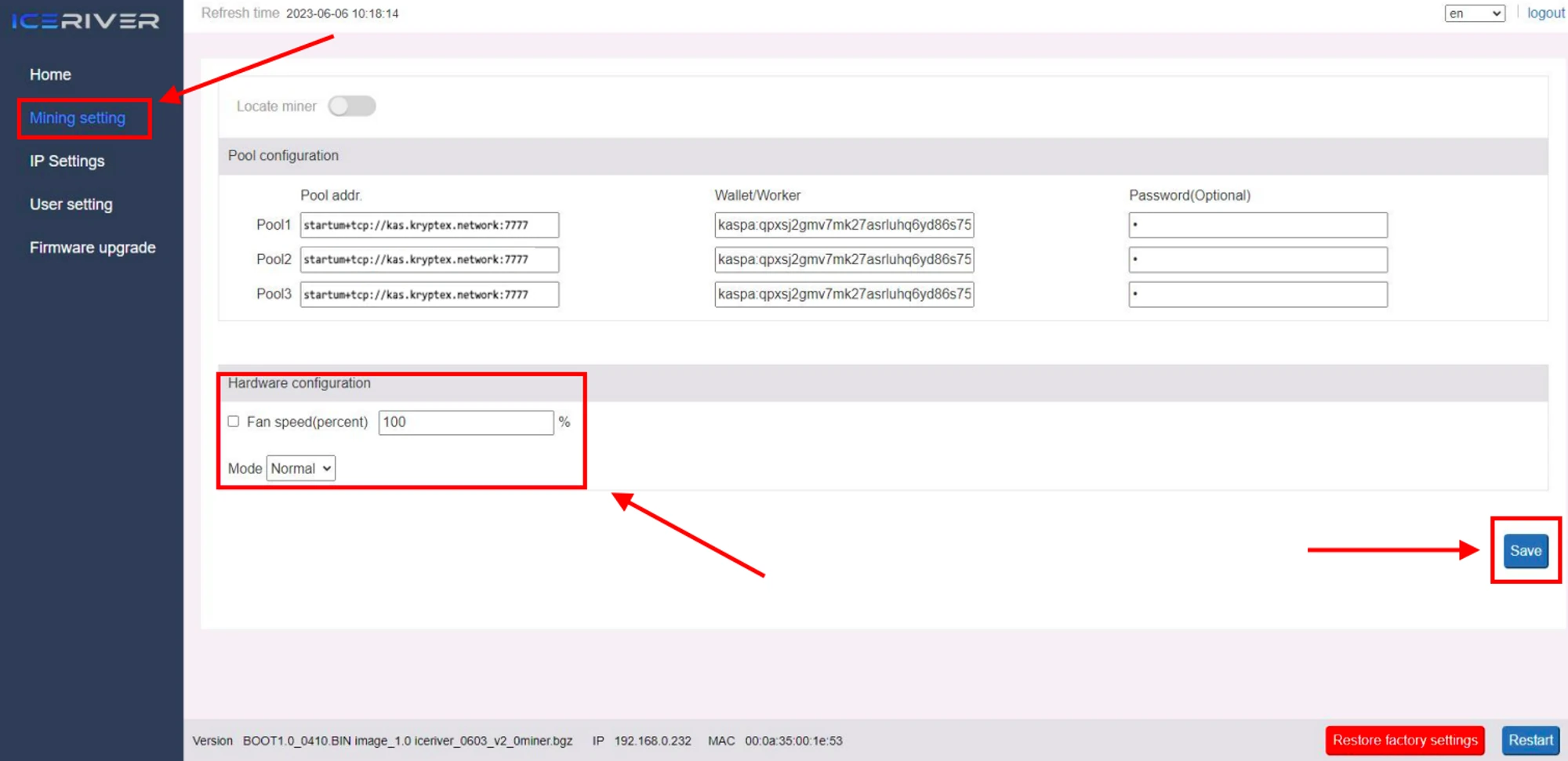 انتقل إلى علامة التبويب "إعدادات التعدين" لإعداد جهاز ASIC الخاص بك.