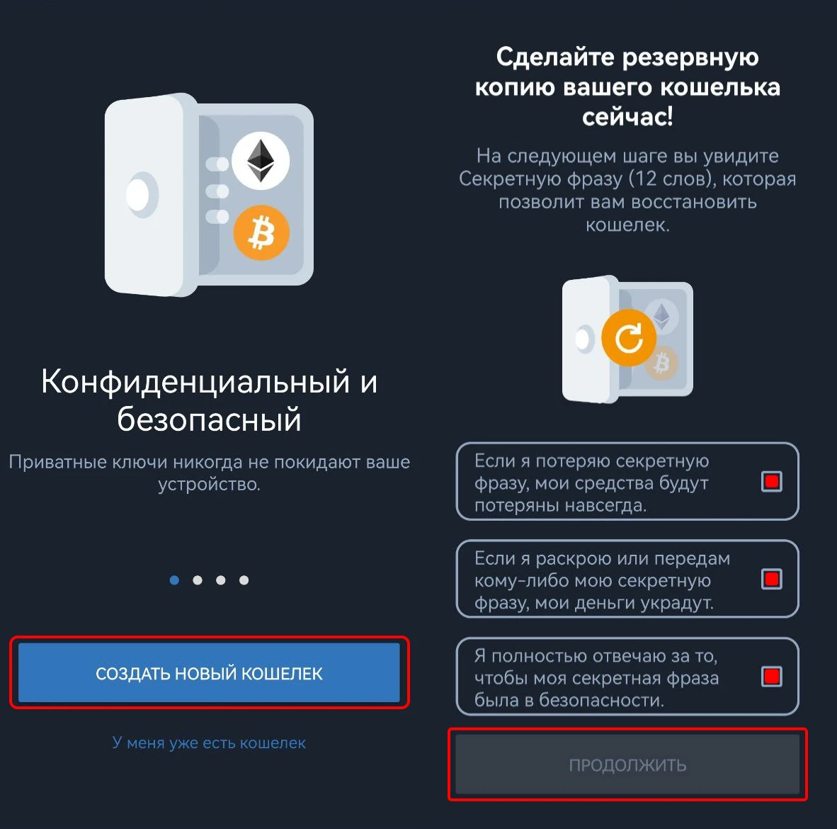 - Надежно сохраните вашу секретную фразу для доступа и восстановления кошелька. Её потеря грозит потерей доступа к кошельку и деньгам.