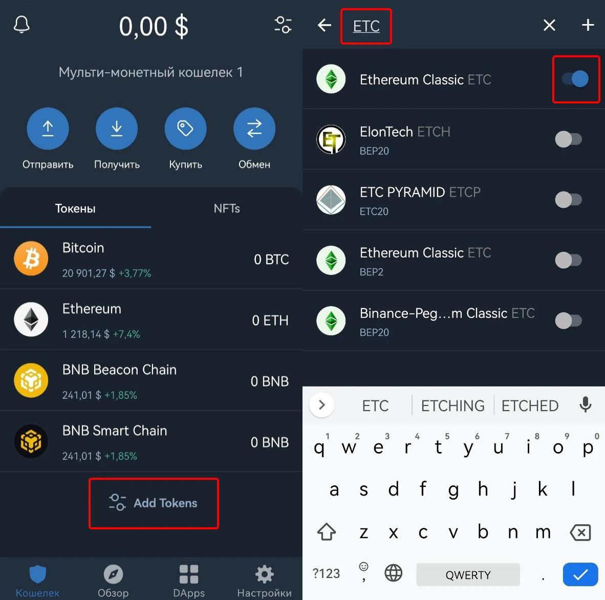 По умолчанию доступны некоторые монеты. Вы можете использовать их, удалить ненужные, или добавить нужные. Добавим ETC. Нажимаем на “Add Tokens”; в строке поиска вводим “ETC”; нажимаем на переключатель, чтобы добавить монету. Выходим в предыдущее меню.