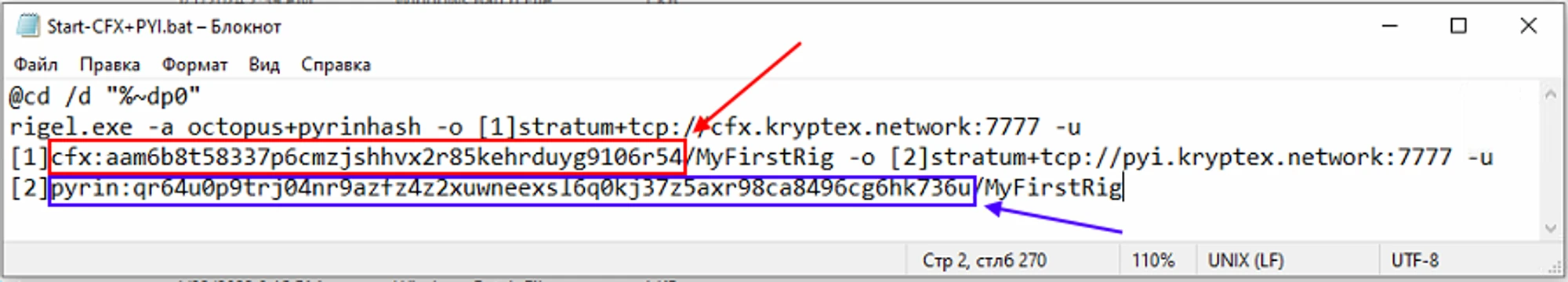 Перед вами відкриється блокнот із налаштуваннями. Вам потрібно замінити адреси гаманців для двох монет CFX та PYI. У файлі вказані адреси для прикладу. Замініть ці адреси на свої гаманці, які ви зареєстрували раніше.
