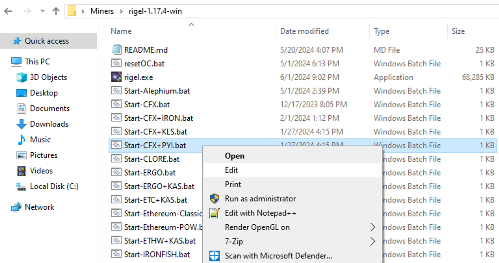 Розпаковуємо завантажений архів і знаходимо батник для потрібного дуал-майнінгу. Наприклад, ми хочемо майнити CFX + PYI. Натискаємо правою кнопкою миші по батнику