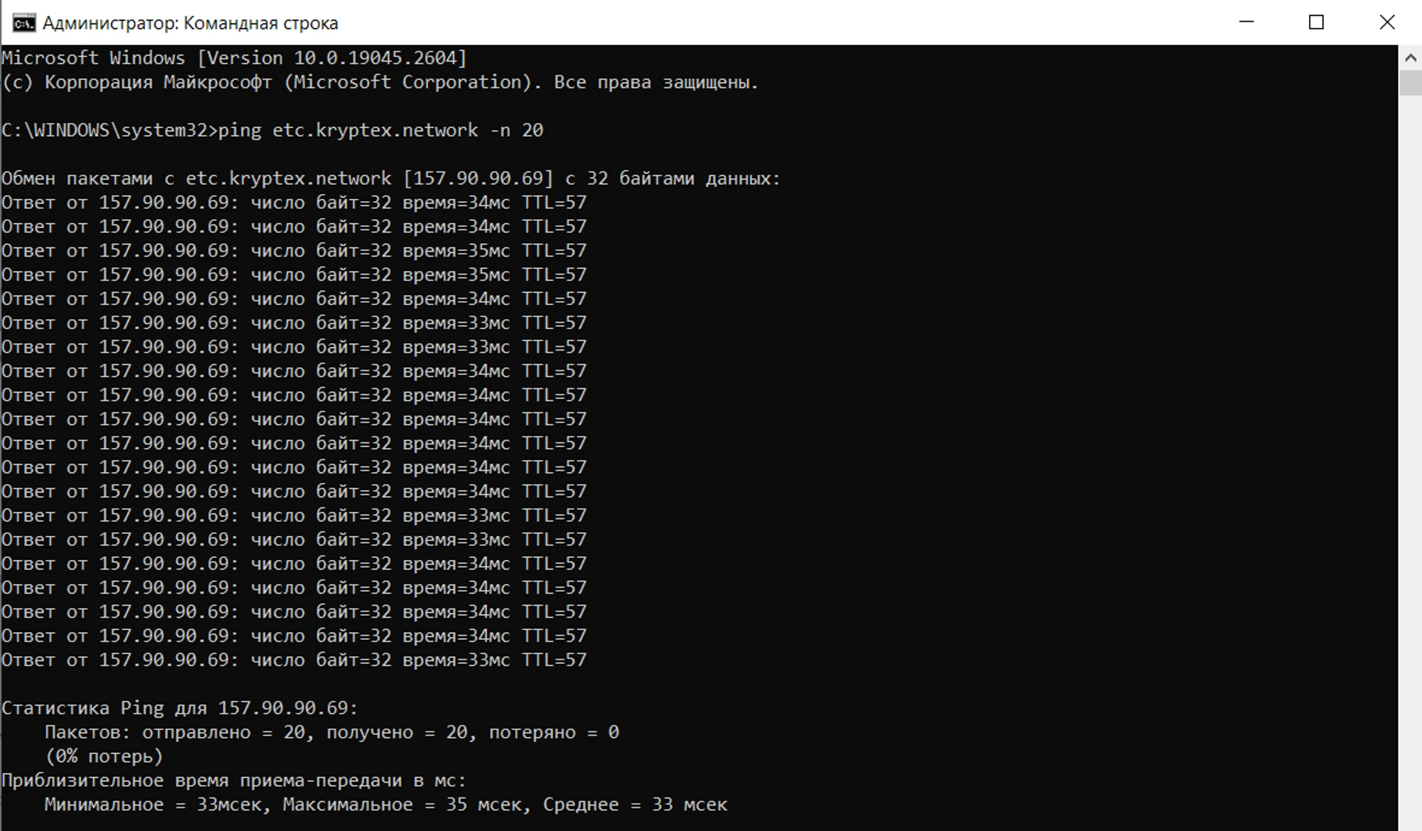 ping etc.kryptex.network -n 20и нажмите Ентер