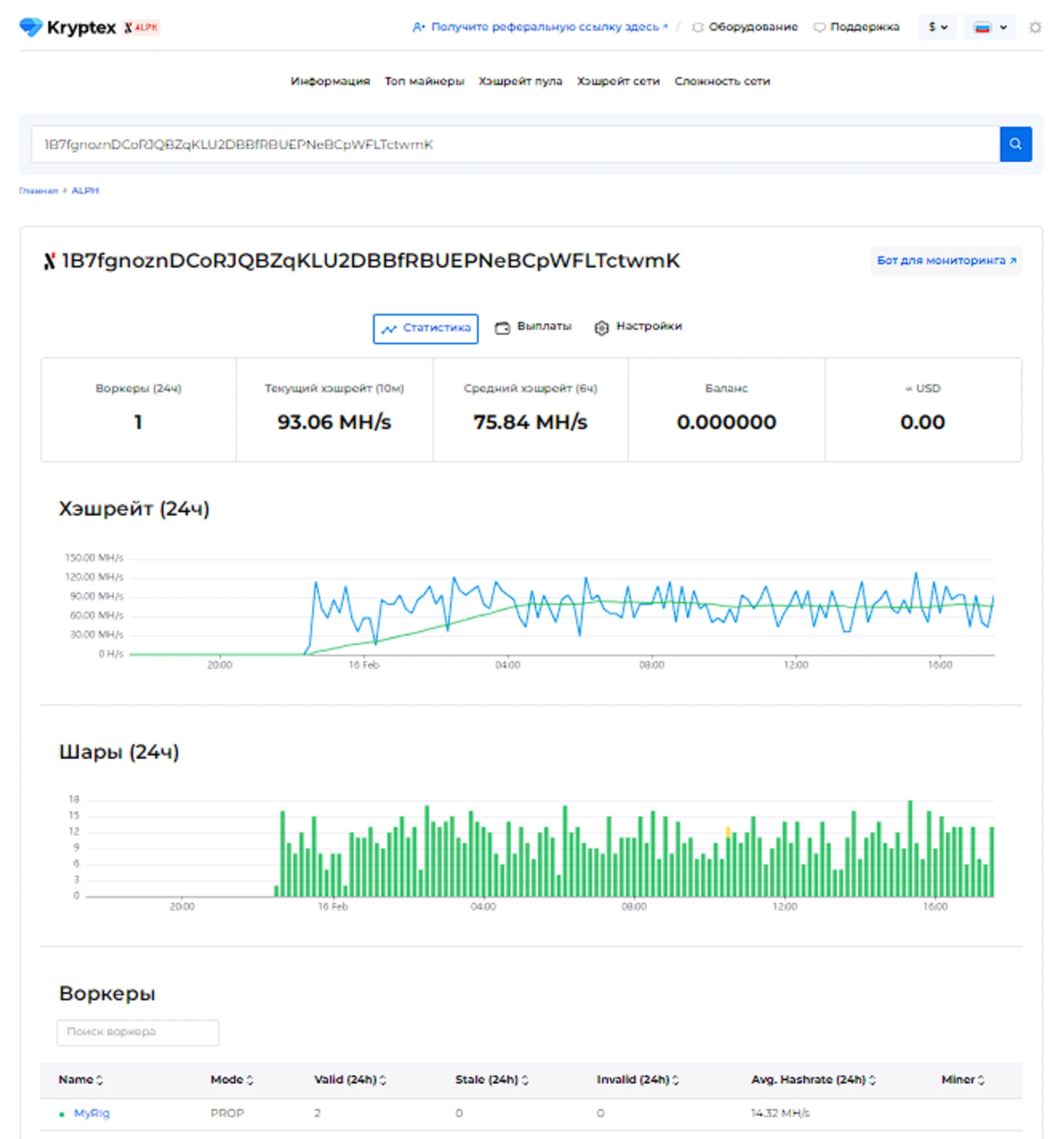 Перед вами откроется страница со статистикой вашего кошелька и ваших рабочих ферм. Статистика появляется через 10-15 минут после запуска майнинга.