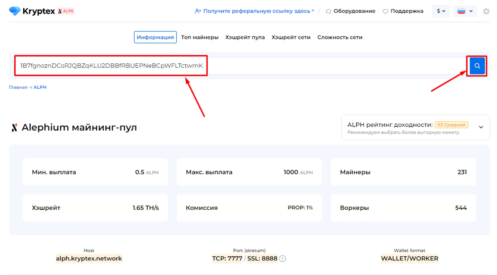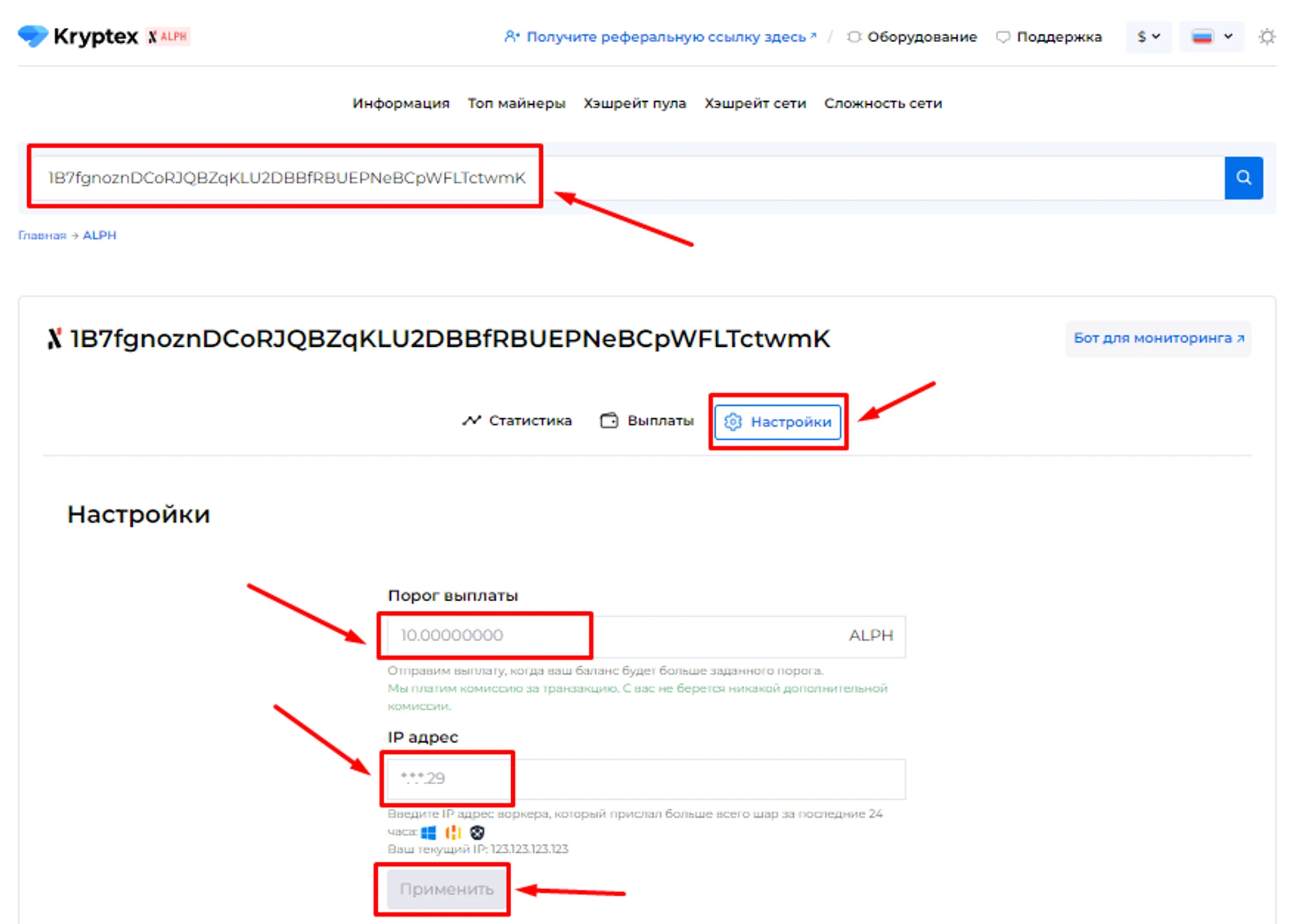 Откройте страницу с пулом и введите адрес вашего кошелька, на который вы майните;
