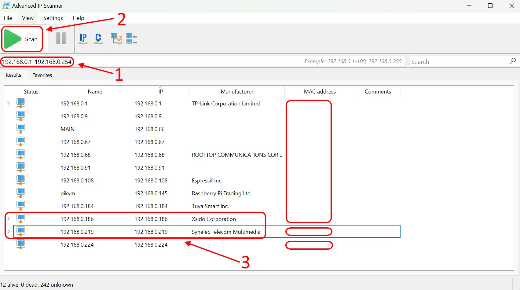 In the Advanced IP Scanner enter the range of IP addresses of your network (for example,