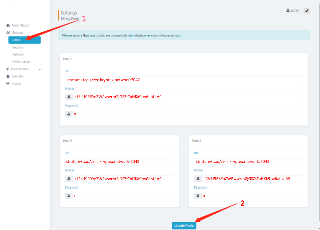 Make sure to complete all three lines with the settings of the same pool. Click “Update Pools” to save the settings and restart the ASIC.