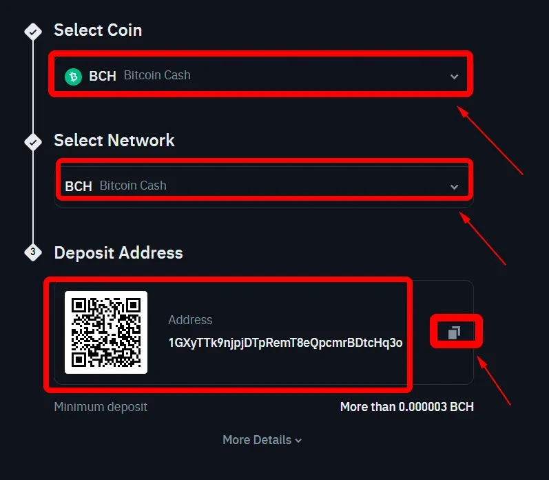 On the deposits page, choose “Coin → BCH” and “Network → BCH” to get your “Deposit Address.”