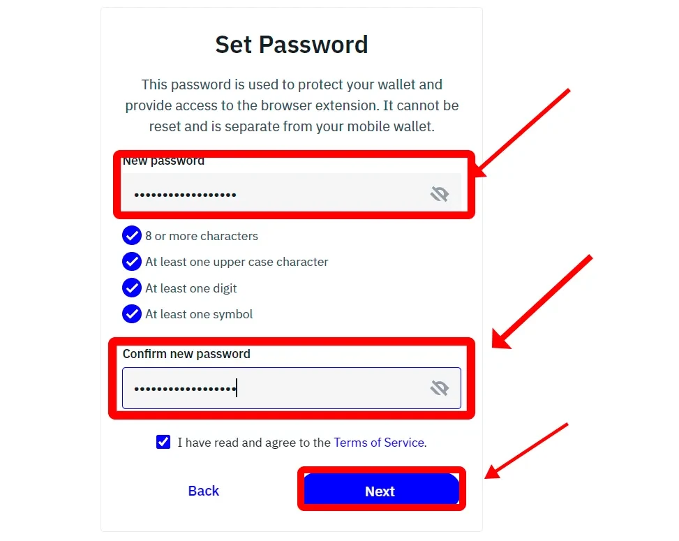 Set a password for your wallet, confirm it, and click “Next.” Please note that this password cannot be recovered, so store it in a safe place!