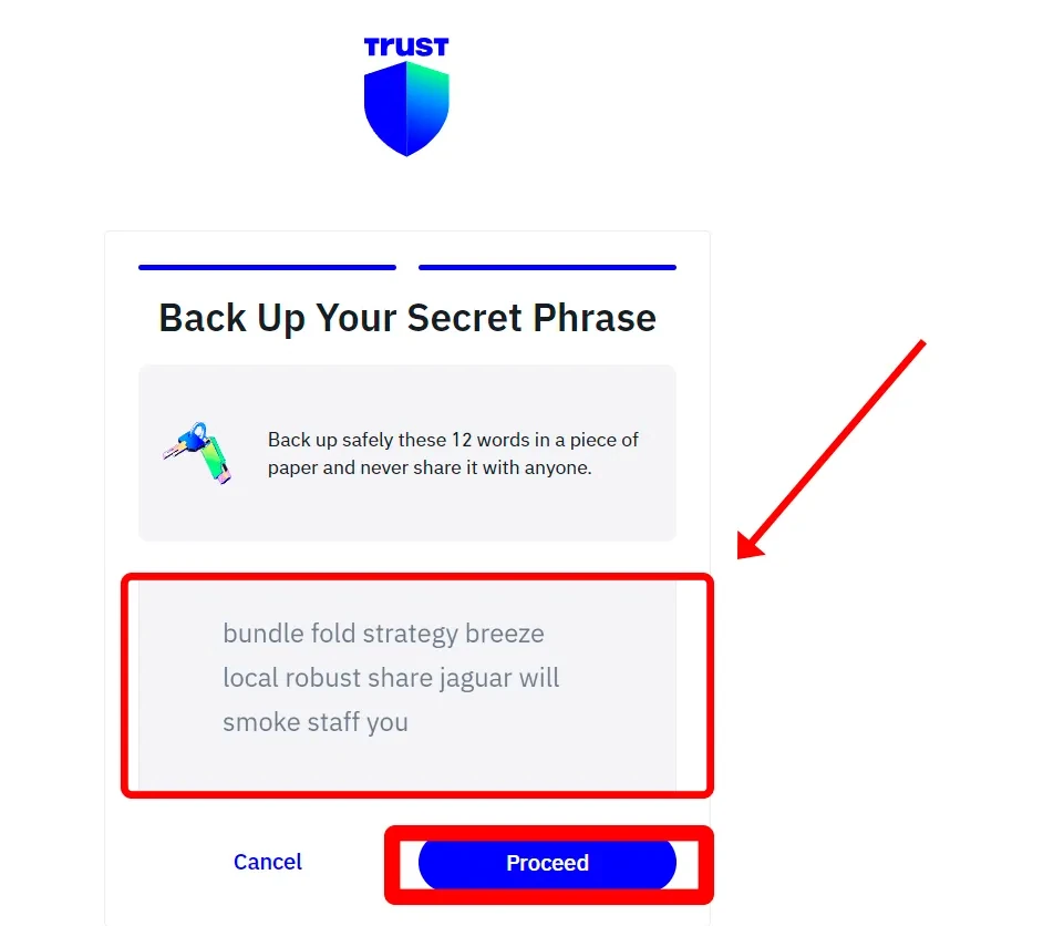 You will then receive a secret phrase – a combination of 12 words. Losing these means losing access to your wallet! Write them down and store them in the exact order shown. After recording, click “Proceed.” The wallet will prompt you to confirm the phrase by placing the words in the correct order.