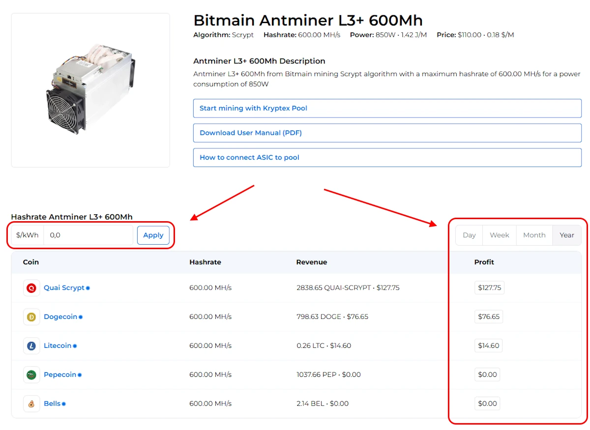 | Antminer L3+ | 600 MH/s (±10%) | 850 W (±10%) | see calculator |