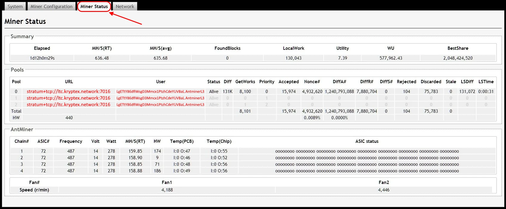 On the "Miner Status" page, you'll see the current status: hash rate, uptime, temperature, and other metrics.