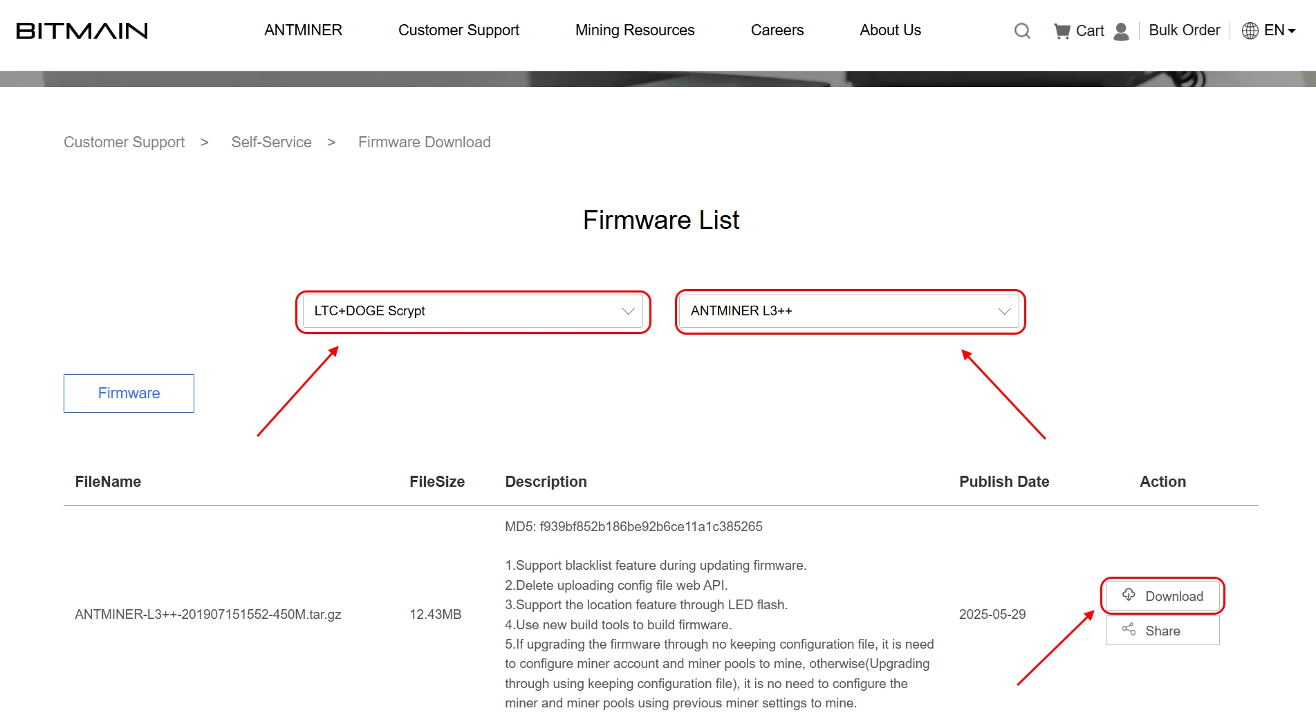 Visit the developer's website and open the firmware download page: https://shop.bitmain.com/support/download.