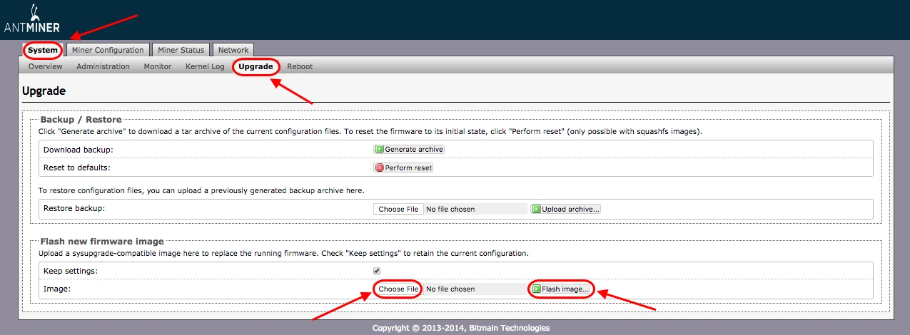 Open the “System” → "Upgrade" page in the ASIC settings.