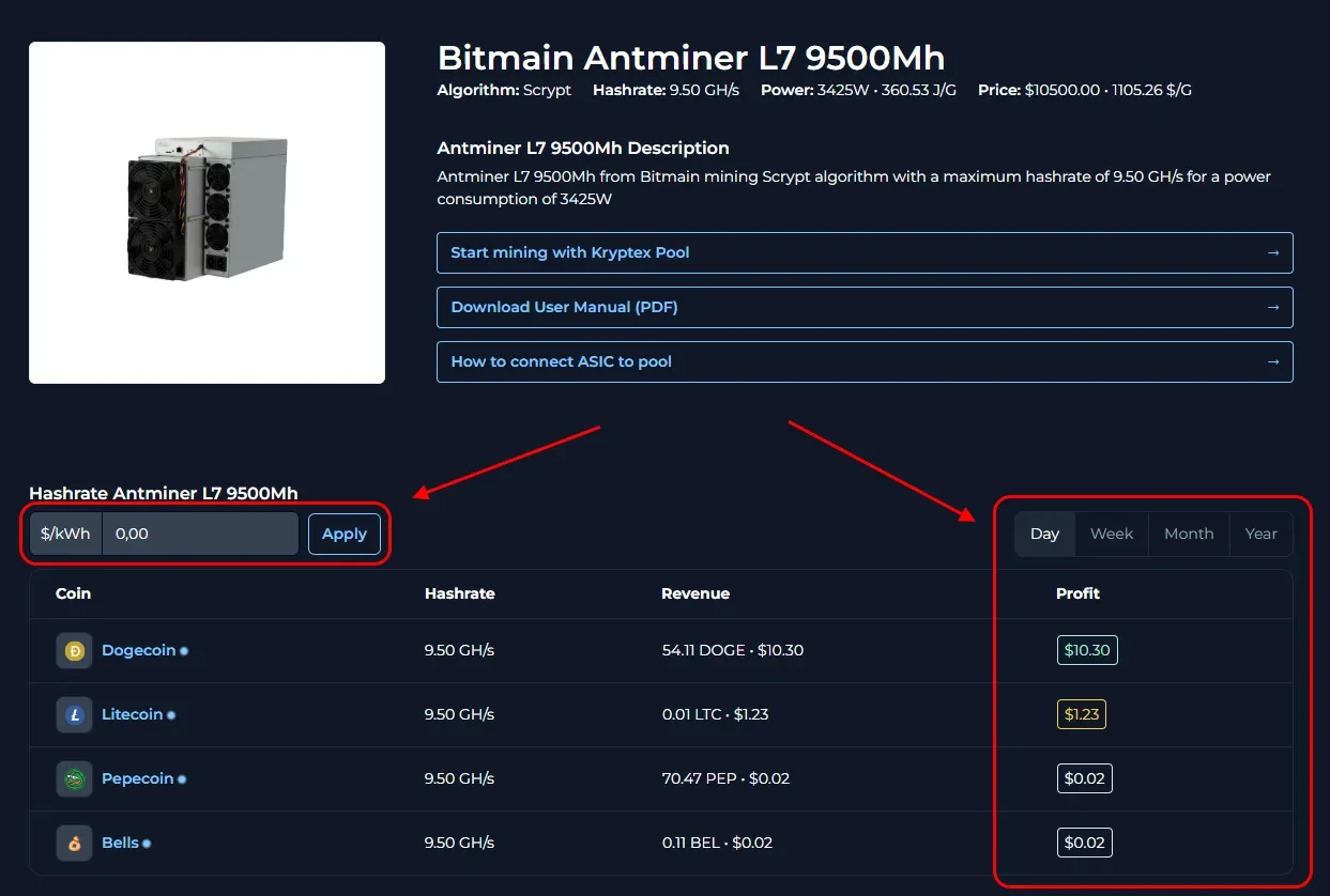 Check the profitability of Bitmain Antminer L7 9500 ASIC on the mining calculator.