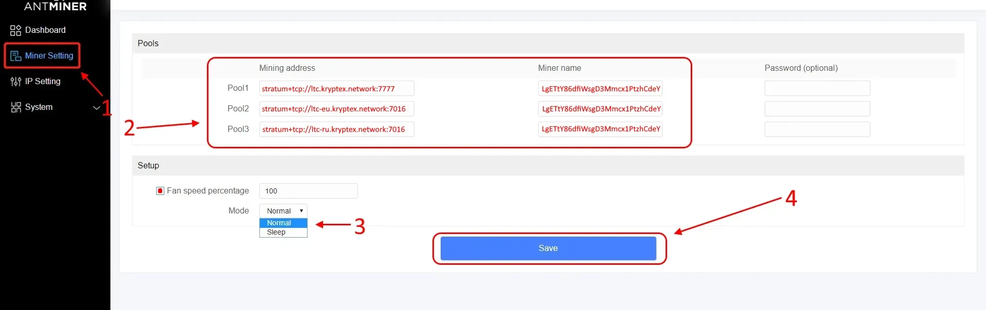 Make sure to complete all three lines with the settings of the same pool. Click “Save” to save the settings and restart the ASIC.