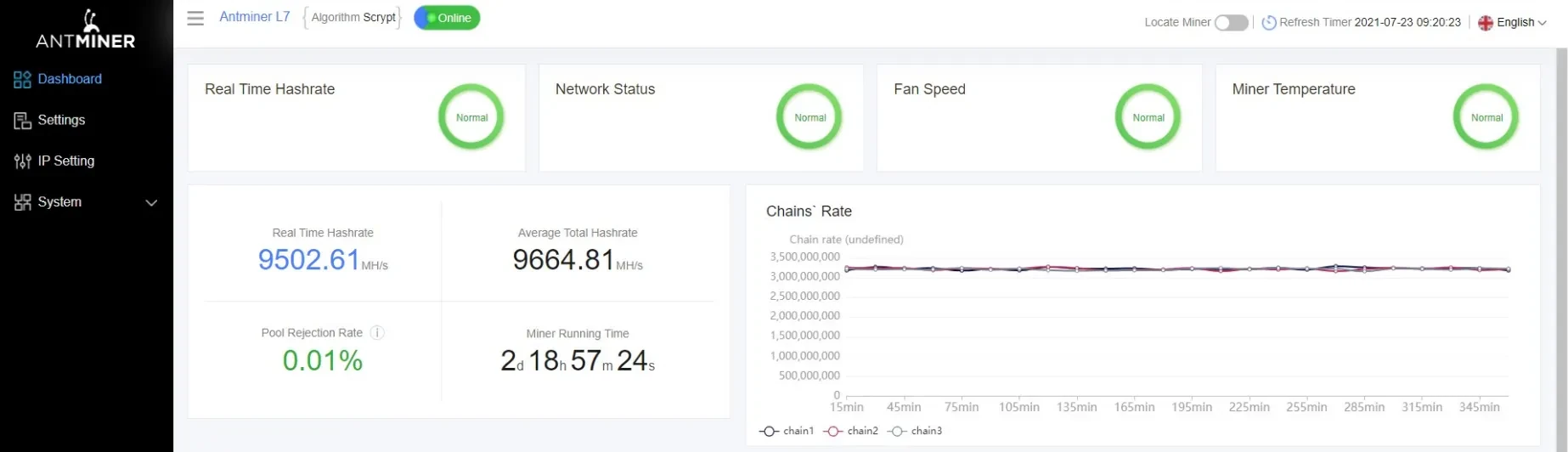 On the “Dashboard” page, you’ll see the current status of the ASIC, including hash rate, uptime, temperature, and other metrics.
