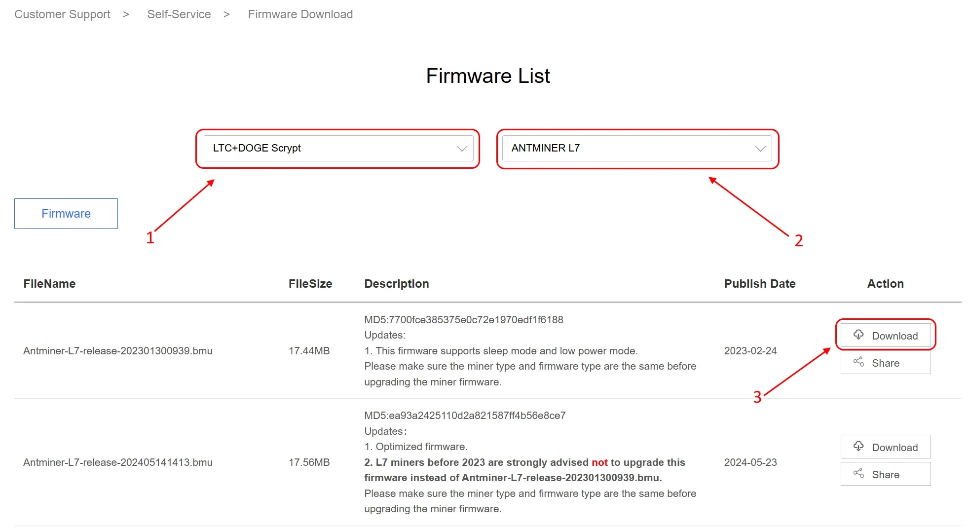 Visit the developer's website and open the firmware download page: https://shop.bitmain.com/support/download.