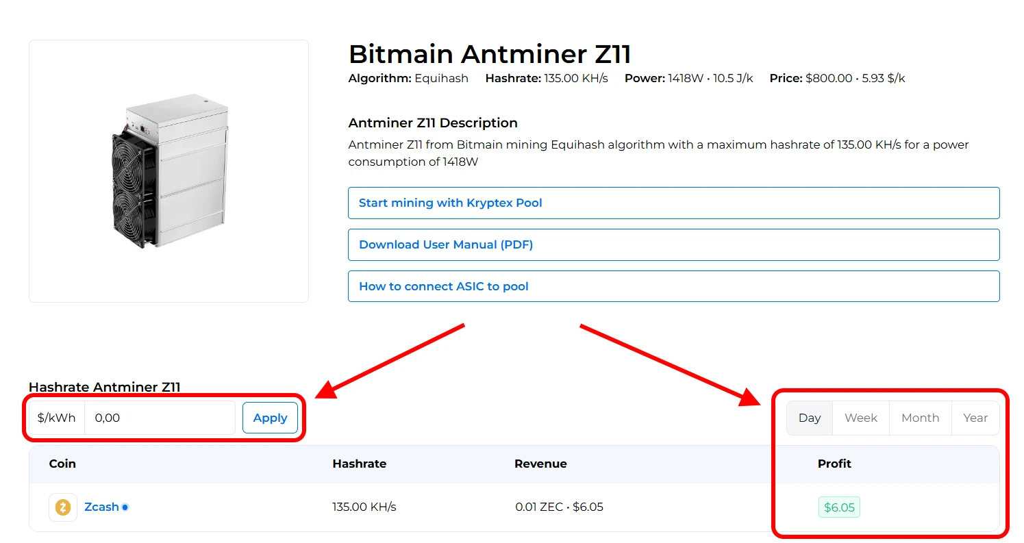 | Z11 | 135 kH/s (±10%) | 1418 Watt (±10%) | ~ $6 / day |