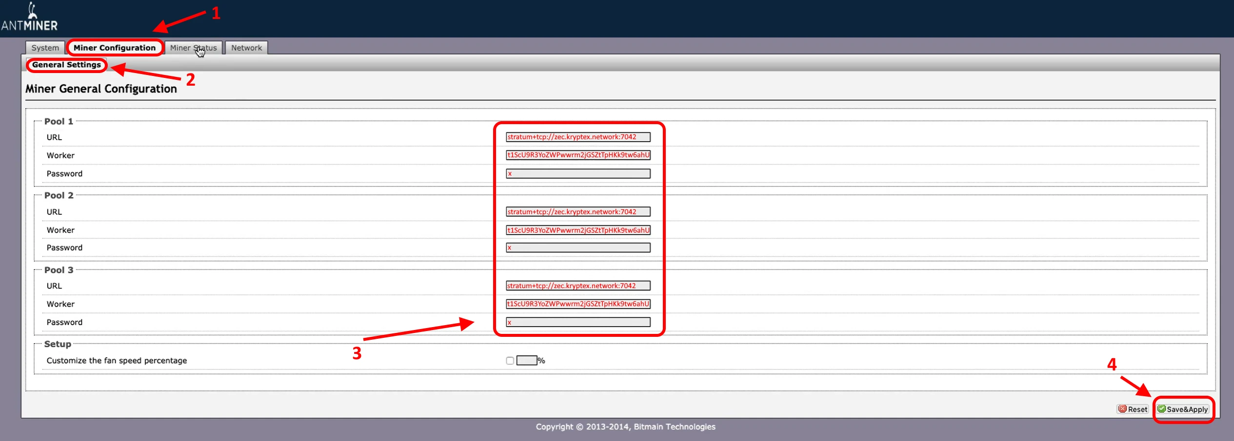 Make sure to complete all three lines with the settings of the same pool. Click “Save&Apply” to save the settings and restart the ASIC.