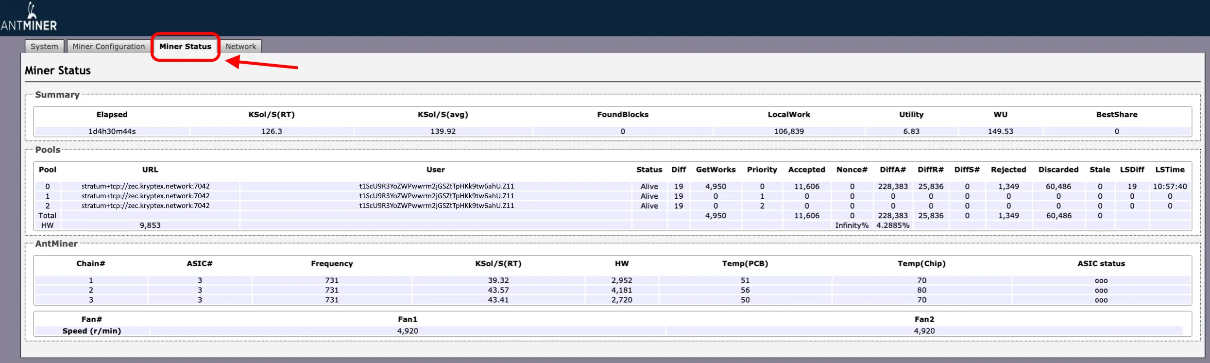 On the “Miner Status” page, you’ll see the current status of the ASIC, including hash rate, uptime, temperature, and other metrics.