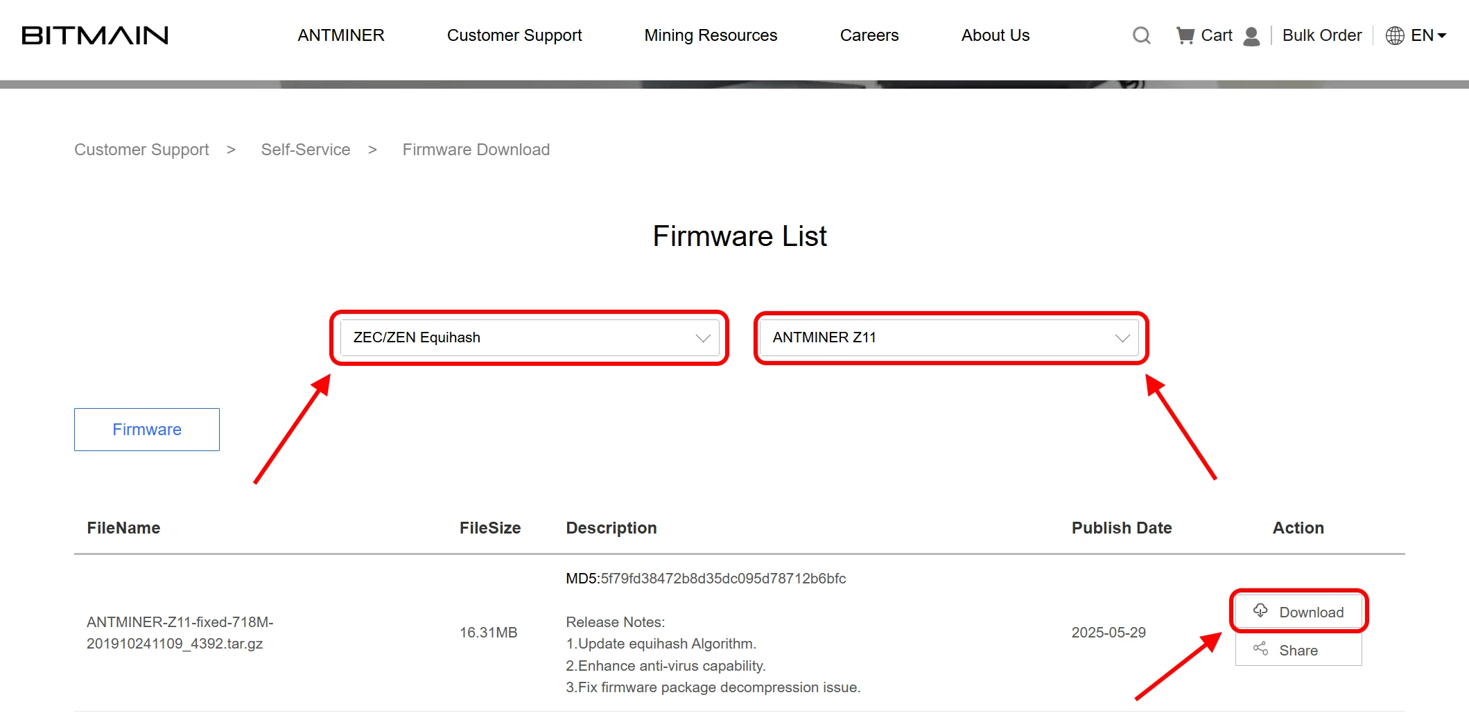 Visit the developer's website and open the firmware download page: https://shop.bitmain.com/support/download.