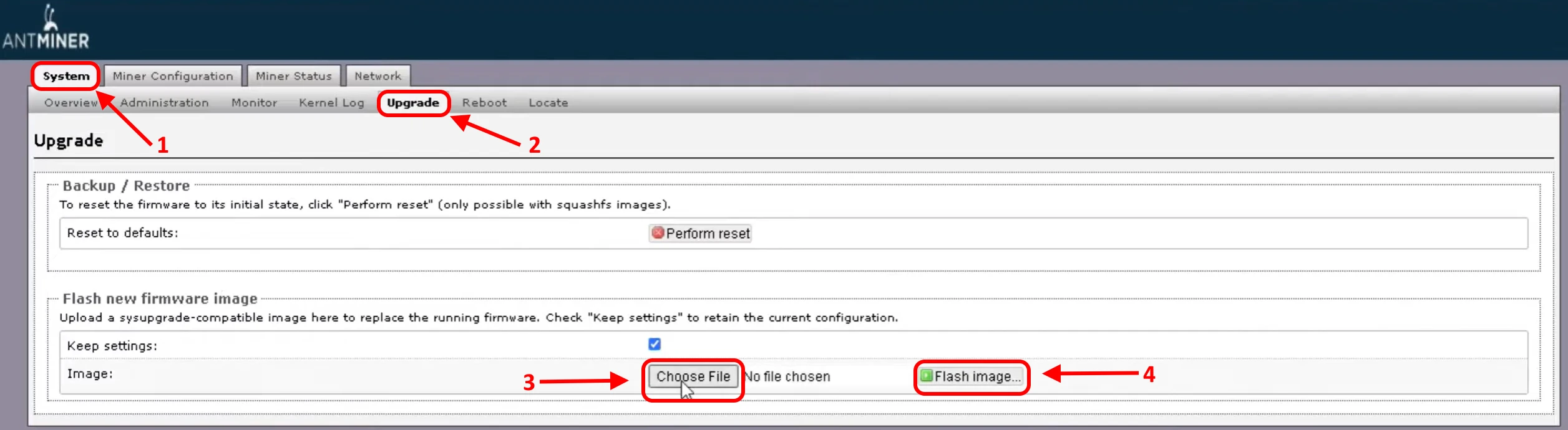 Open the “System” → “Upgrade” section in your ASIC settings: