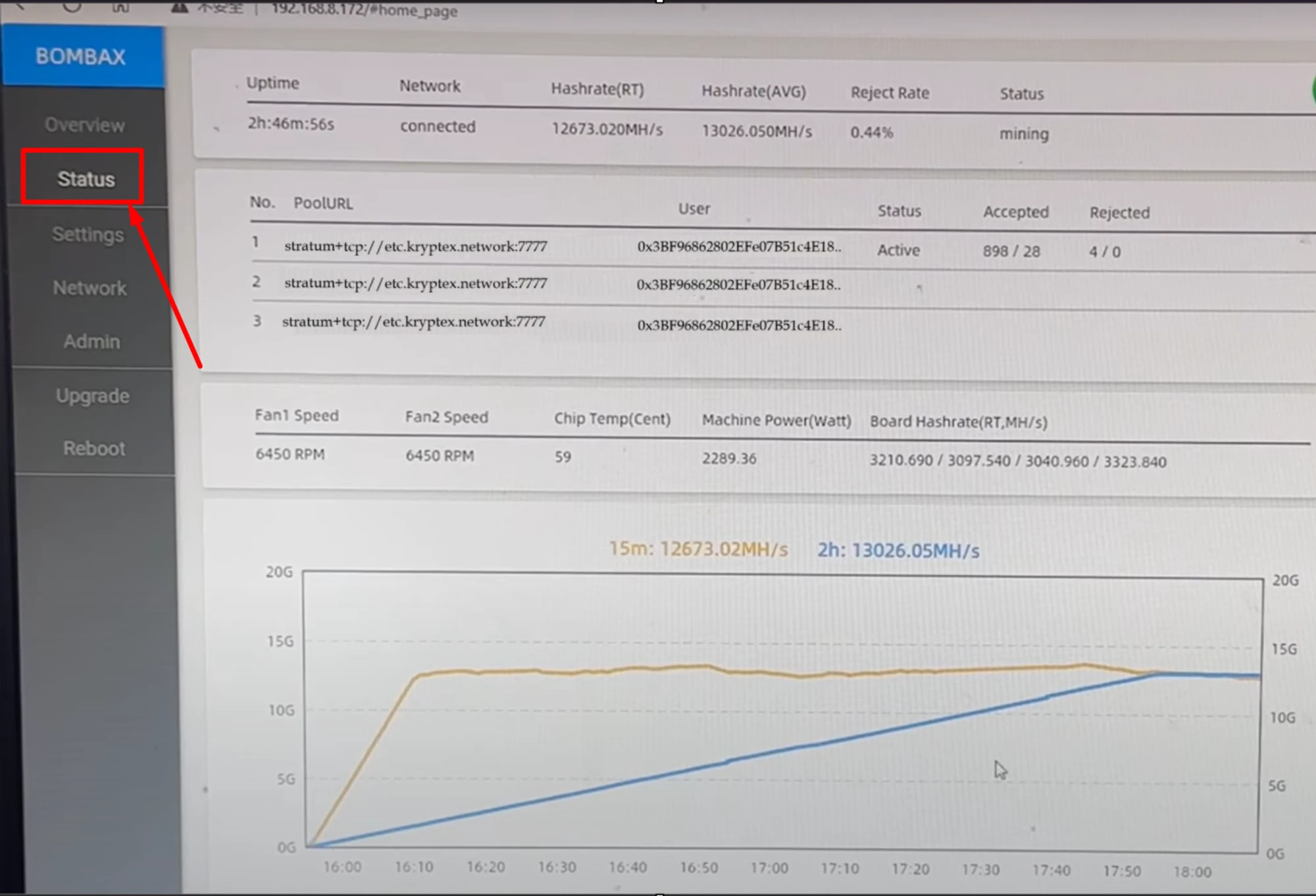 Monitor your ASIC’s work on the “Status” page. Here you will see your hashrate, statistics of accepted shares and all related information.