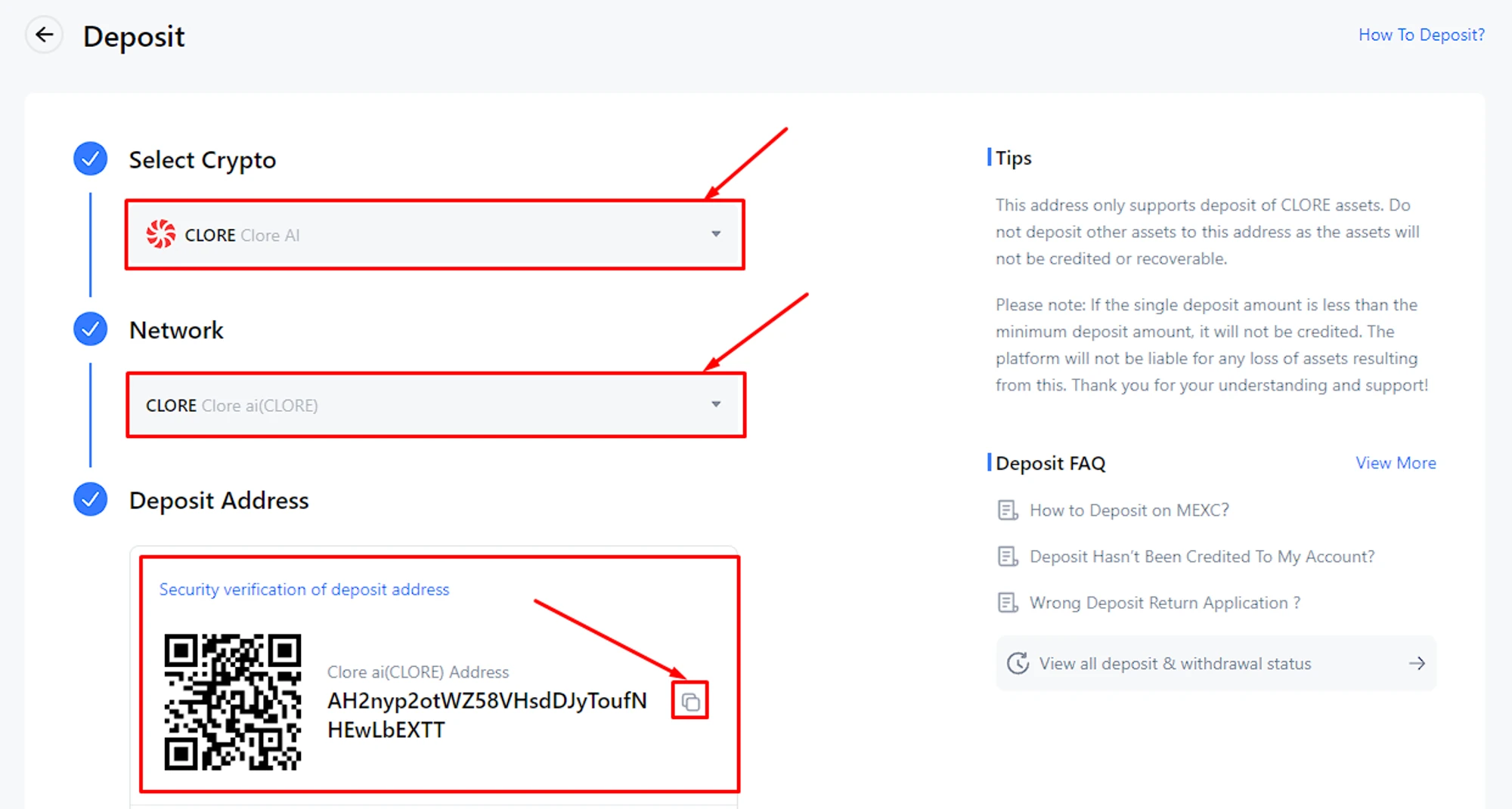 Select "Select Crypto → CLORE", "Network → CLORE", get "Deposit Address";