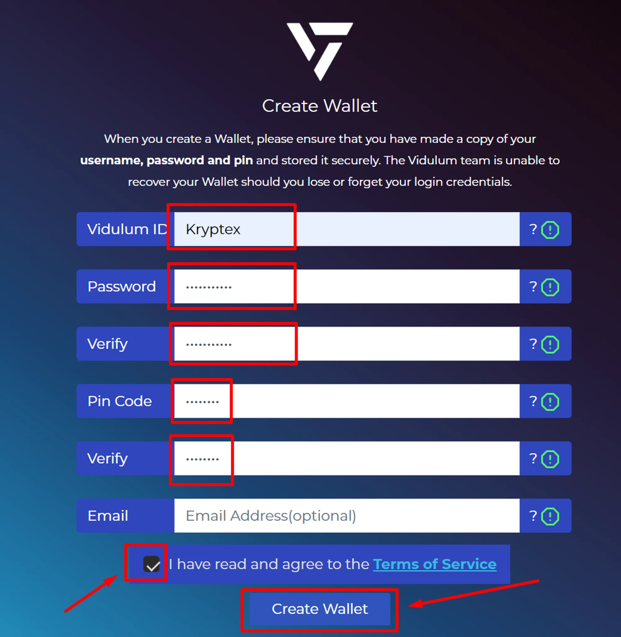 Specify "Vidulum ID" (come up with a username for the wallet) → specify password → confirm password → specify pin code and confirm pin code → accept user agreement → click "Create Wallet”;