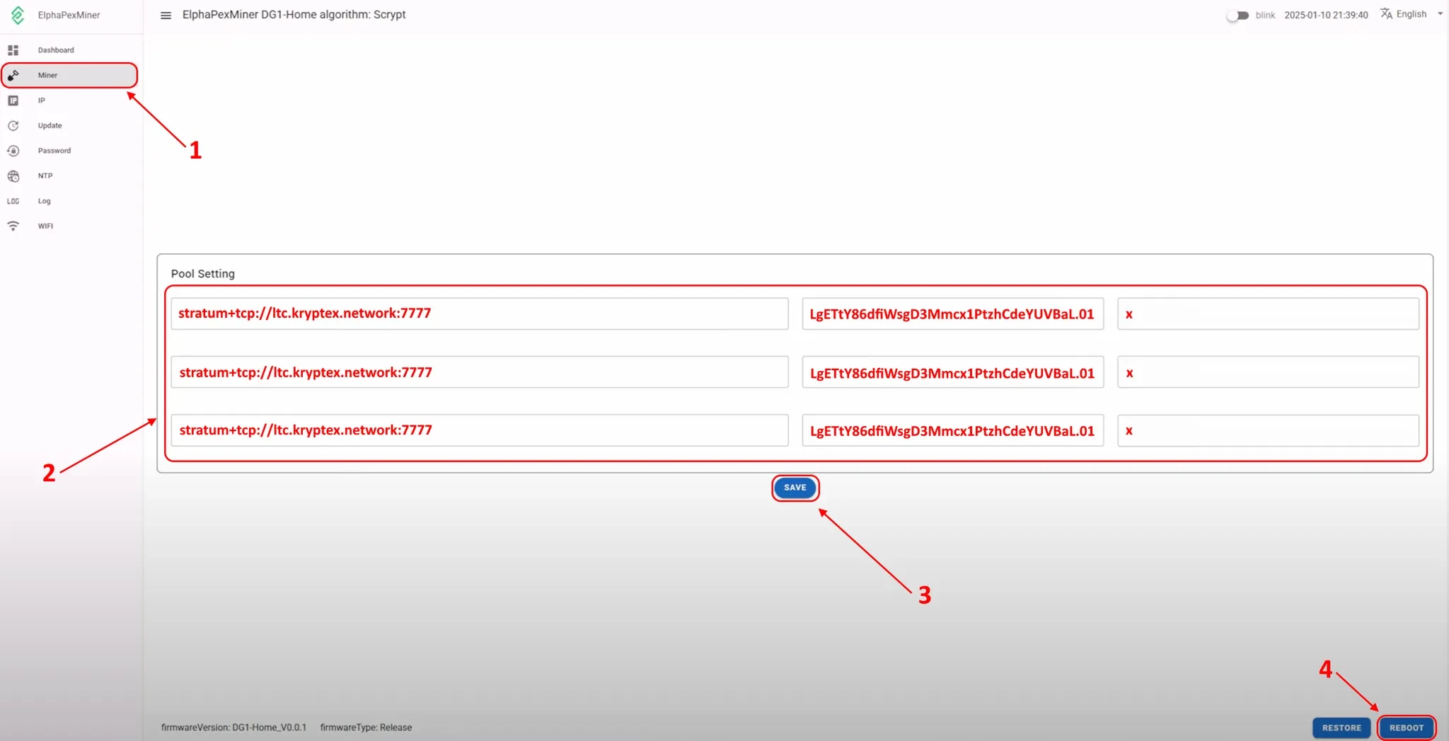 Click “Save” to save the settings and then “Reboot” to apply settings and start mining.