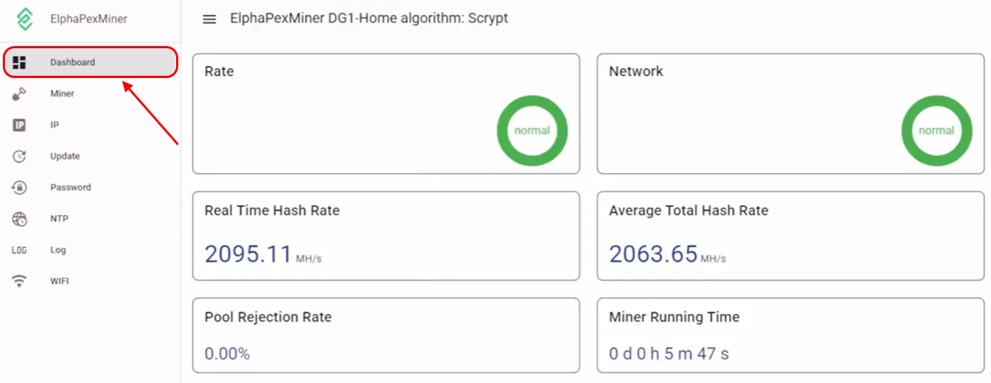 Monitor your ASIC’s work on the “Dashboard” page. Here you will see your hashrate, statistics of accepted shares and all related information.