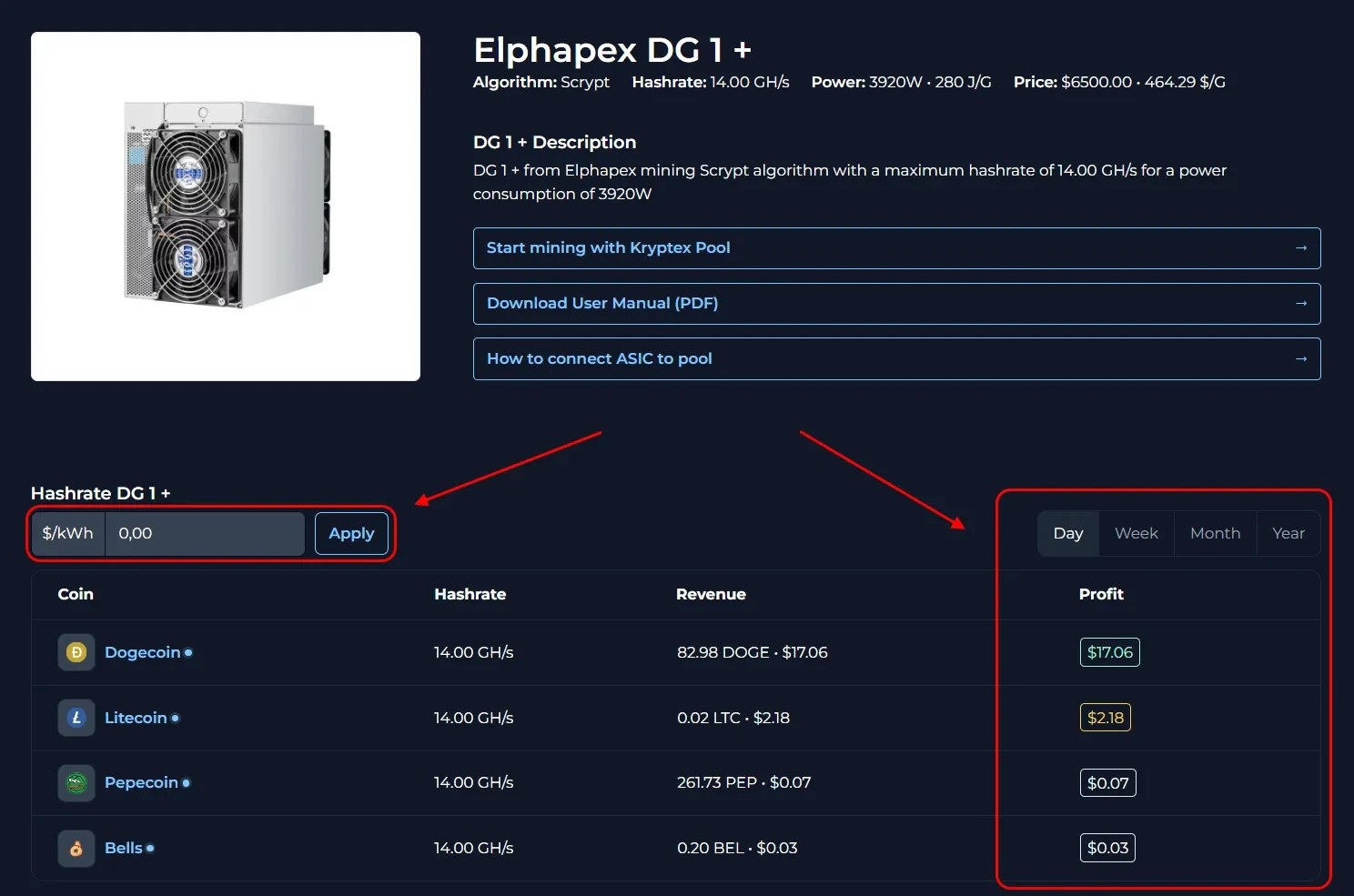 Check the profitability of Elphapex DG1 ASIC on the mining calculator.