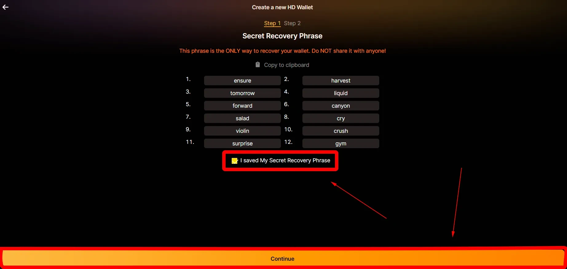 Next, you’ll receive a secret recovery phrase — a 12-word combination. Losing this means losing access to your wallet! Write down and securely store the phrase in the exact order presented.