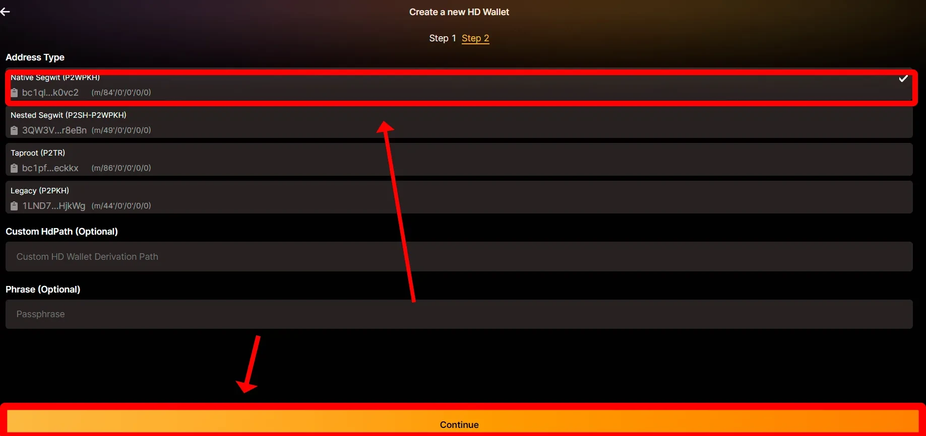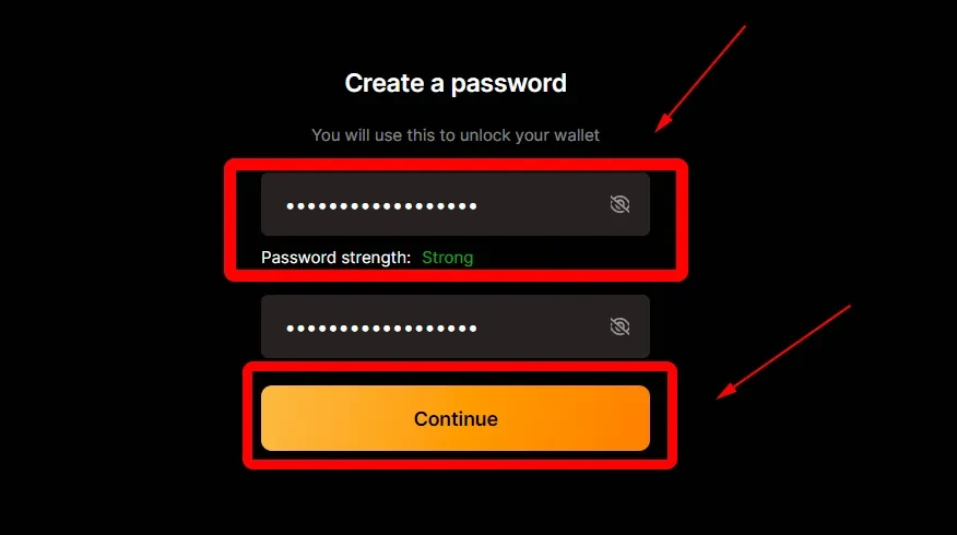 Set and confirm a password for the wallet, then click “Continue”. Please note that your password cannot be recovered, so make sure to write it down and keep it safe!