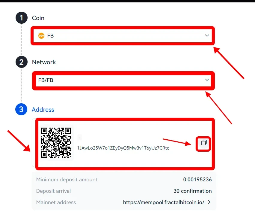 In the deposit page, choose “Coin → FB,” “Network → FB/FB,” and get the “Deposit Address”;