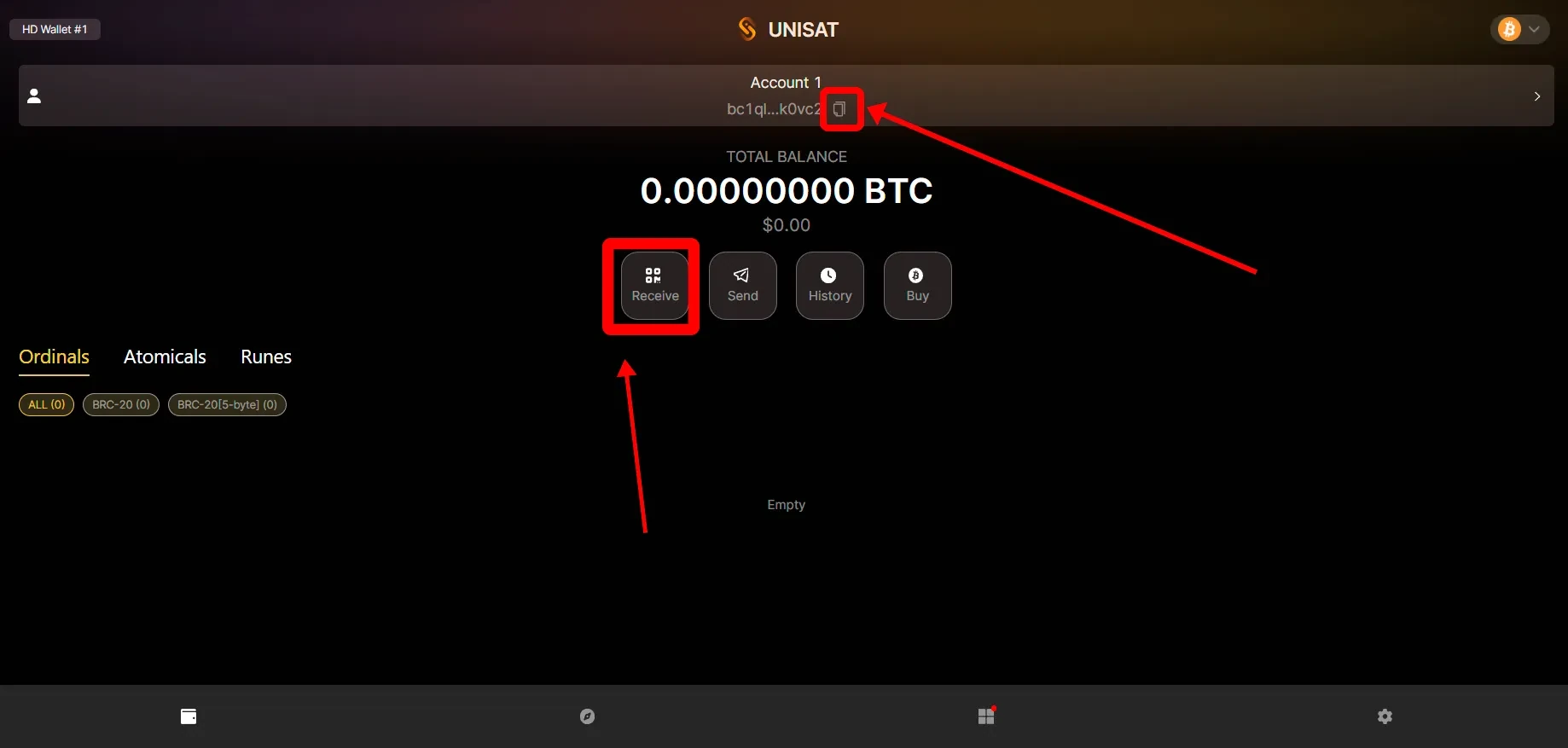Your wallet is now ready. Copy the wallet address by clicking the icon next to it. Use it for mining or receiving coins.