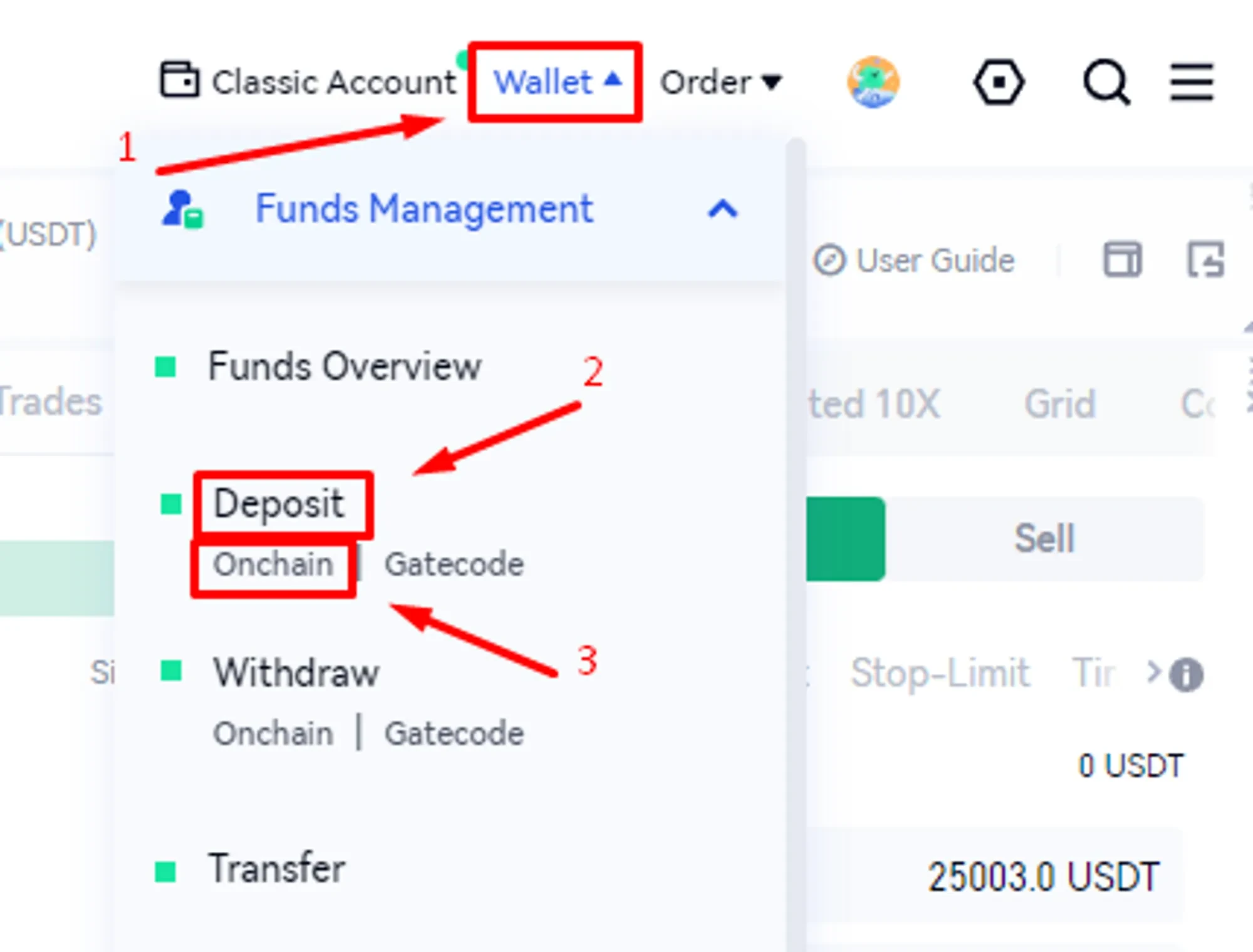 After registration, select “Wallet” → “Deposit” → “Onchain”;
