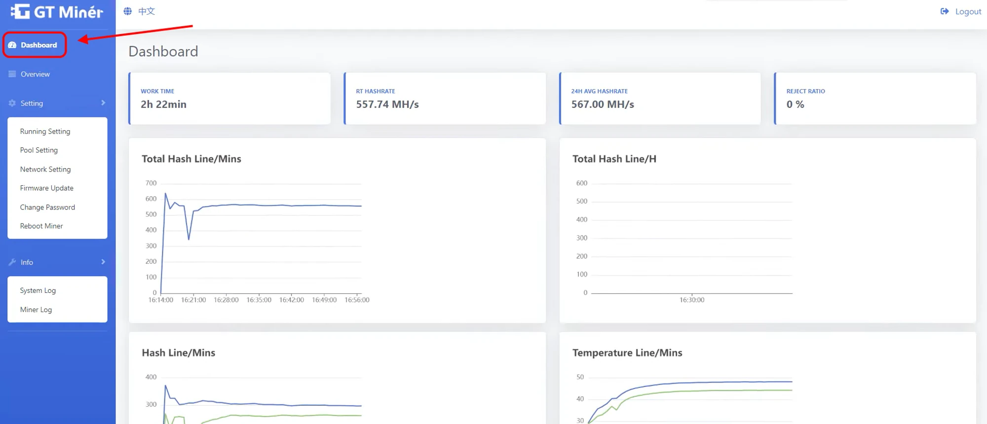 Monitor your ASIC’s work on the “Dashboard” page. Here you will see your hashrate, statistics of accepted shares and all related information.