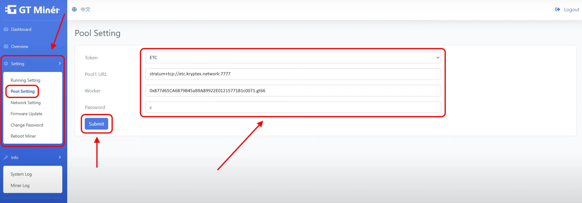 Press “Submit” to save the settings, then reboot your ASIC from the “Reboot Miner” menu.