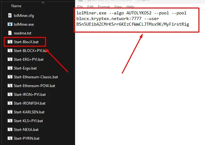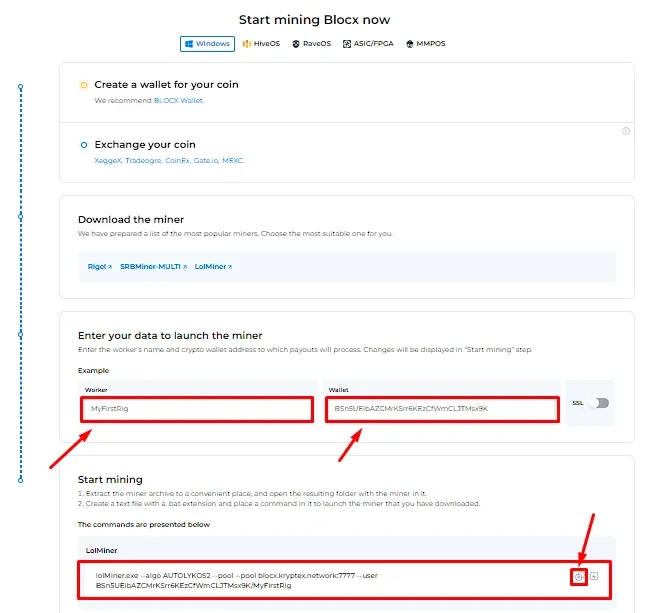 Download a miner for BlocX. We recommend Rigel for NVIDIA and lolMiner for NVIDIA and AMD. We will use lolMiner in the example.
