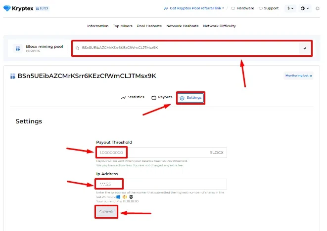 Set the desired “Payment Threshold”. Minimum and maximum payment threshold mentioned at the pool home page. There is no payout fee — Kryptex pays it for you 🖤
