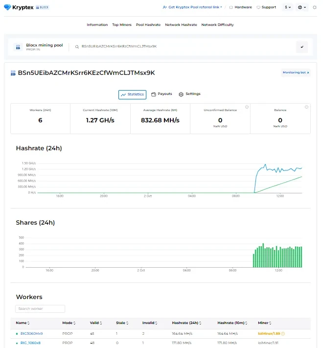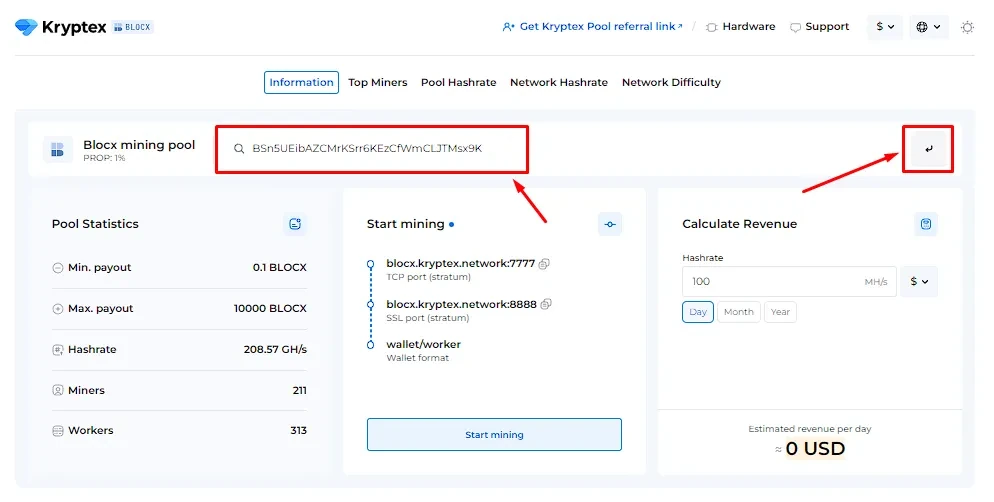 Open the BlocX pool page https://pool.kryptex.com/blocx
