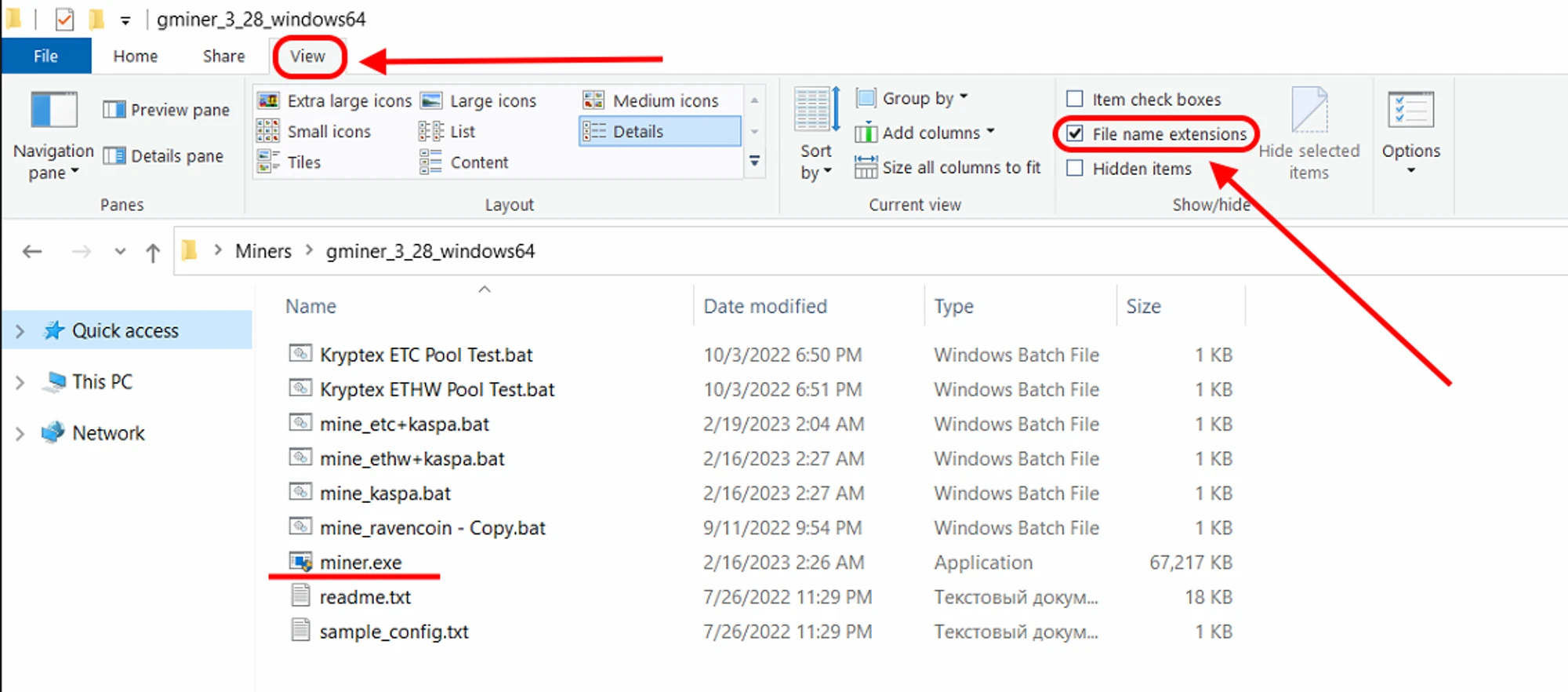Open the folder with the miner, and turn on the display of file extensions: