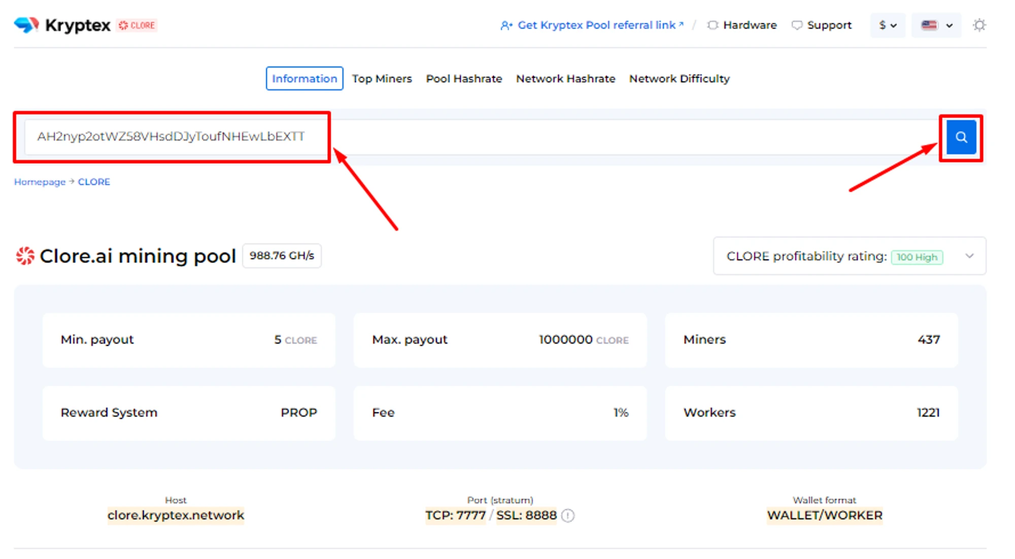Open CloreAI pool page https://pool.kryptex.com/clore