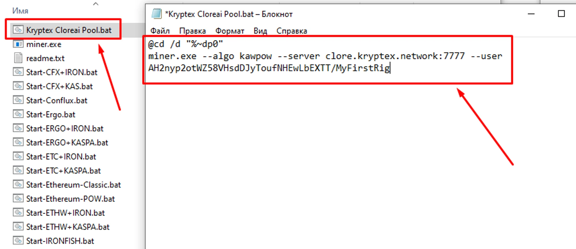 MyFirstRig. Please note that the name is entered only in Latin letters, or numbers, without spaces.Copy the finished command from the cell “BAT file example” by pressing special “Copy” button.