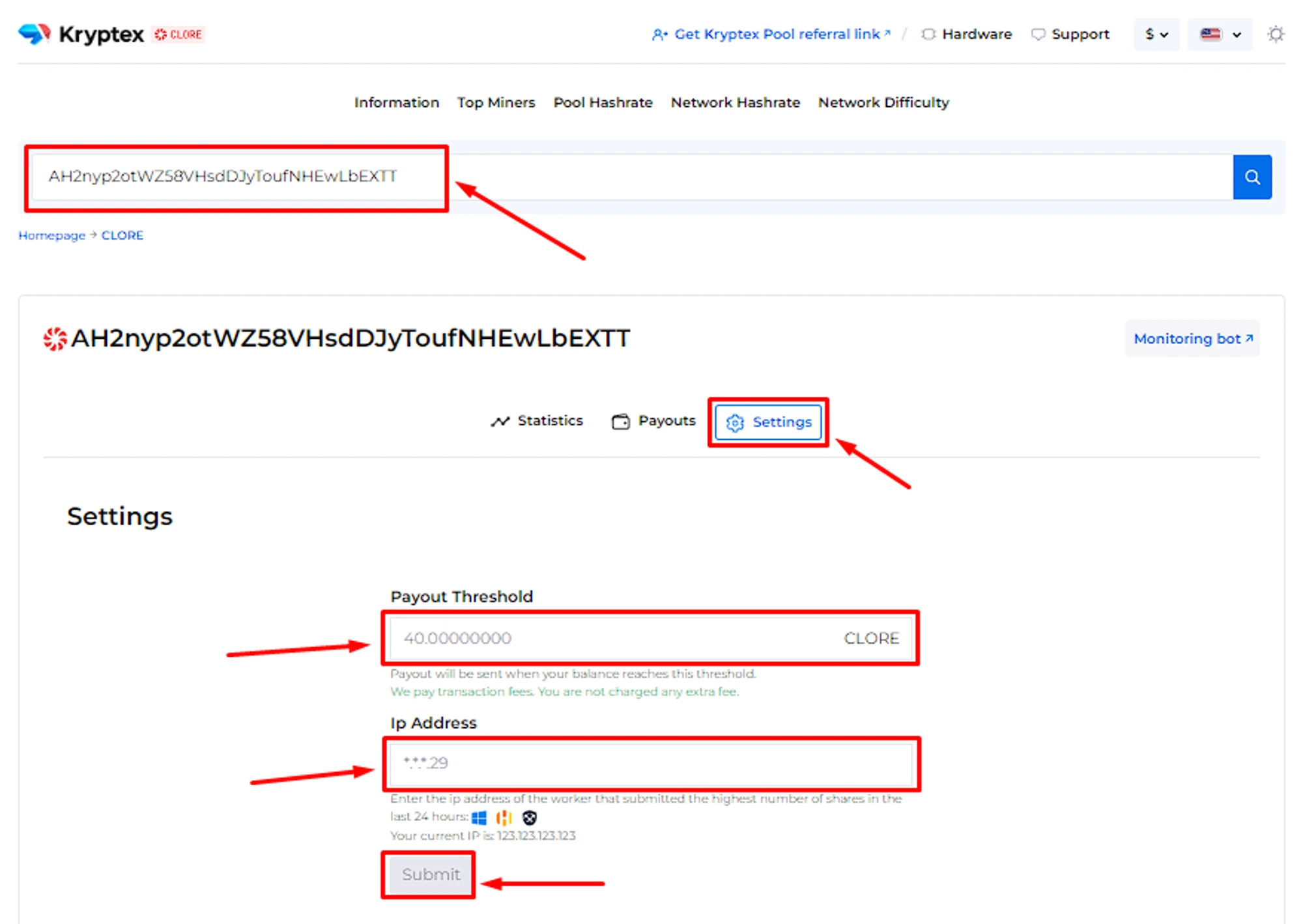 Set the desired “Payment Threshold”. Minimum and maximum payment threshold mentioned at the pool home page. There is no payout fee — Kryptex pays it for you 🖤