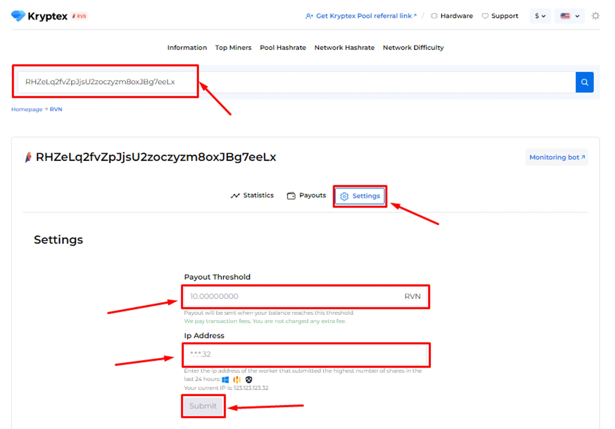 Set the desired “Payment Threshold”. Minimum and maximum payment threshold mentioned at the pool home page. There is no payout fee — Kryptex pays it for you 🖤