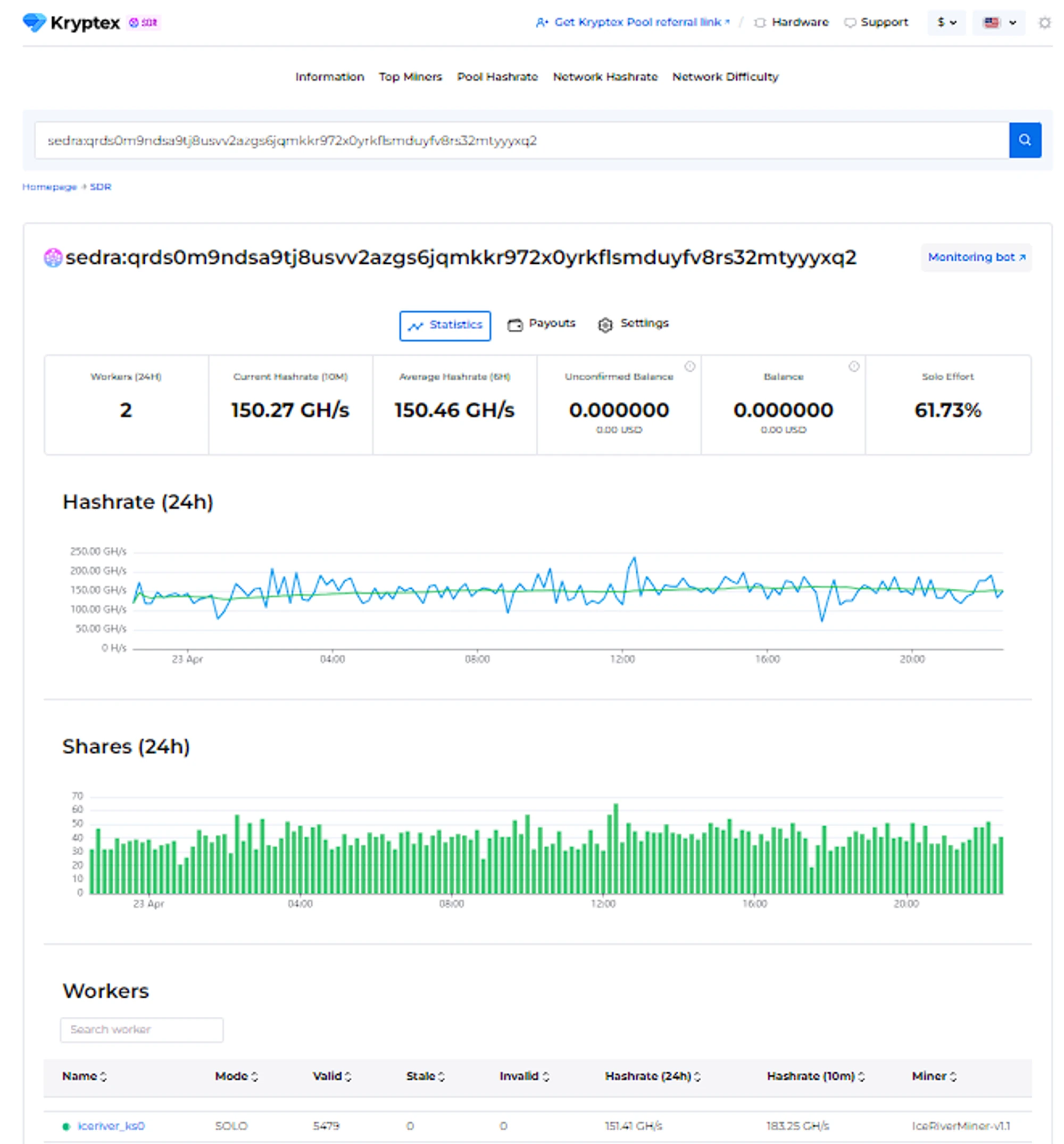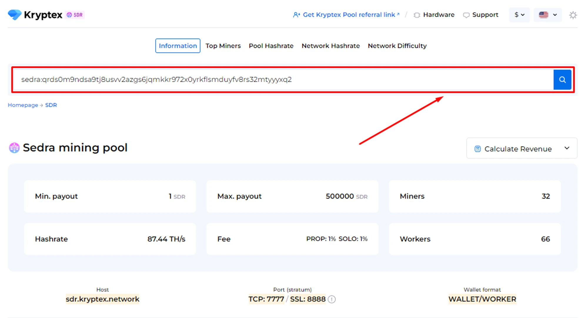 Pool address: stratum+tcp://sdr.kryptex.network:7018